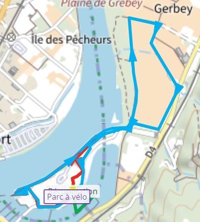 Un parcours mixte entre chemin, terre, et pelouse autour de la presqu'île. Le parcours est disponible ci-dessous.